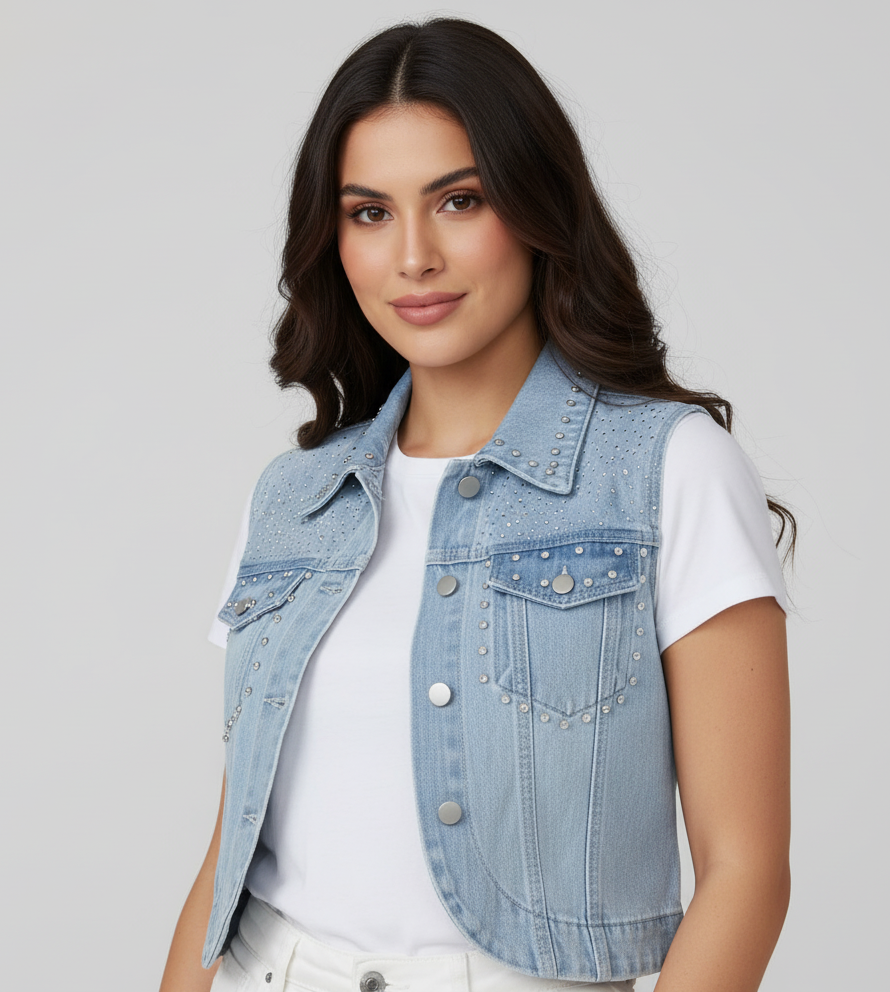 DETALLES: Chaleco de mezclilla con pedrería