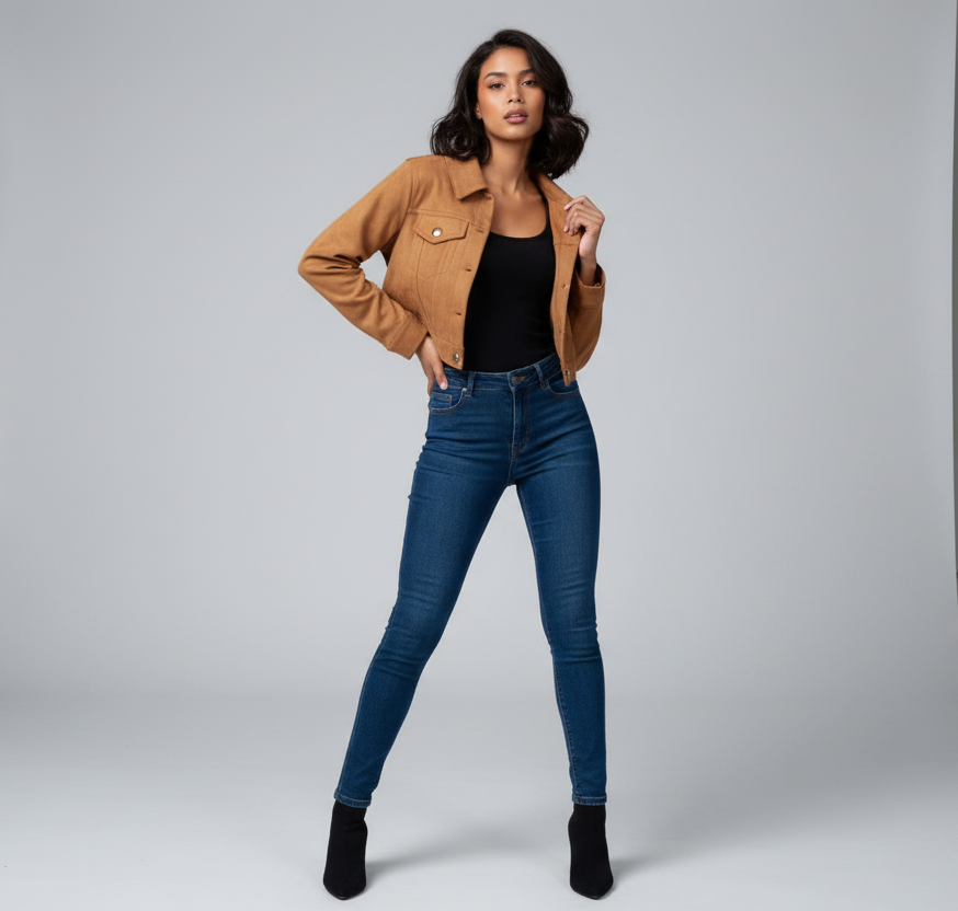 DETALLES: Chamarra de gamuza con botones y bolsas en el busto.