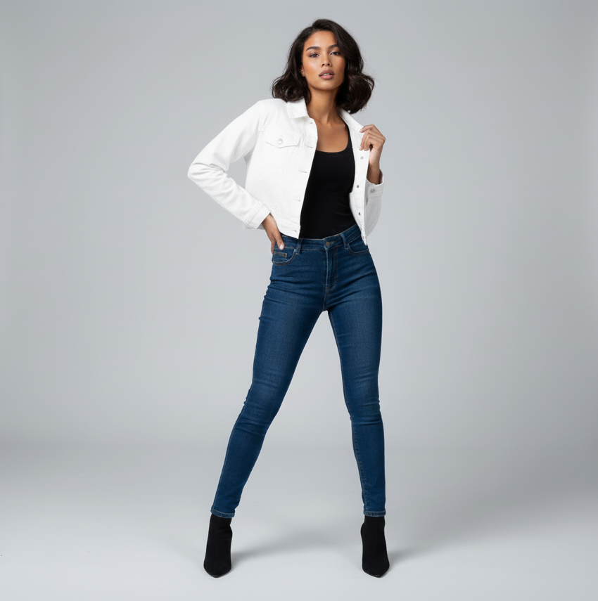 DETALLES: Chamarra de mezclilla color blanca con botones y bolsas en la parte del pecho.