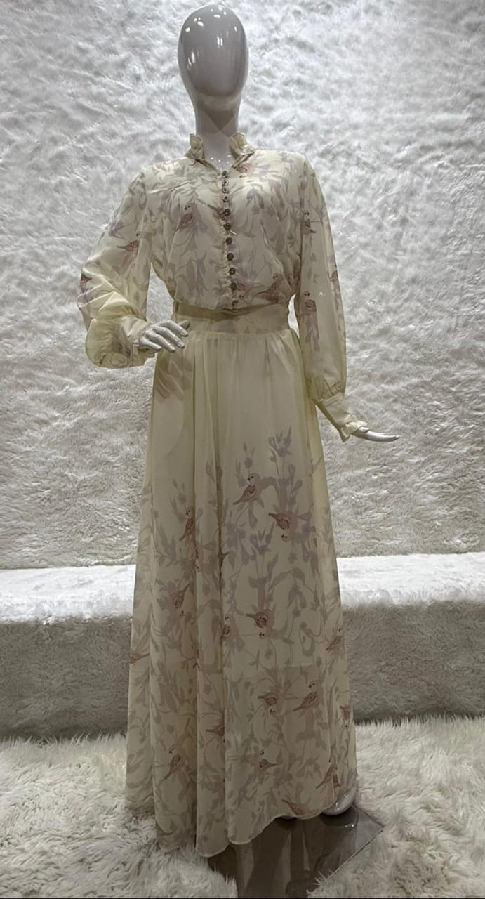 DETALLES: set blusa y falda con estampado de pajaritos la falda tiene elástico y bolsas y la blusa botones