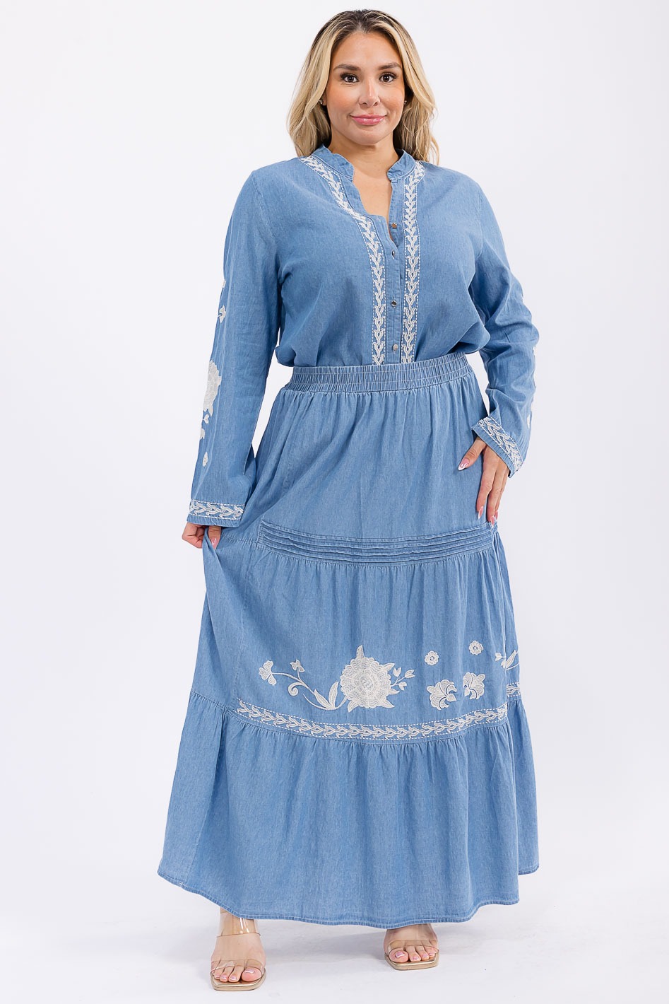 DETALLES: Conjunto maxi de tejido tipo mezclilla ligero con bordado floral decorativo en contraste, compuesto por una blusa de cuello mao y una falda larga de volantes escalonados.