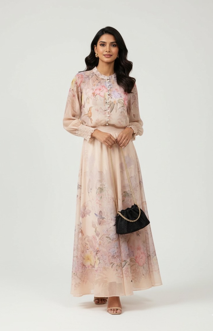 DETALLES: Falda & Blusa con estampado floral con la blusa con botones de perlas y la falda con elástico y bolsas.