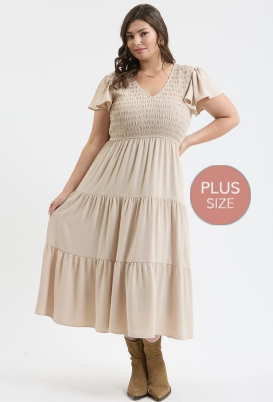 DETALLES: Vestido midi de talla grande con cuerpo fruncido de nido de abeja, escote en V, mangas cortas tipo mariposa y falda de corte en niveles.
