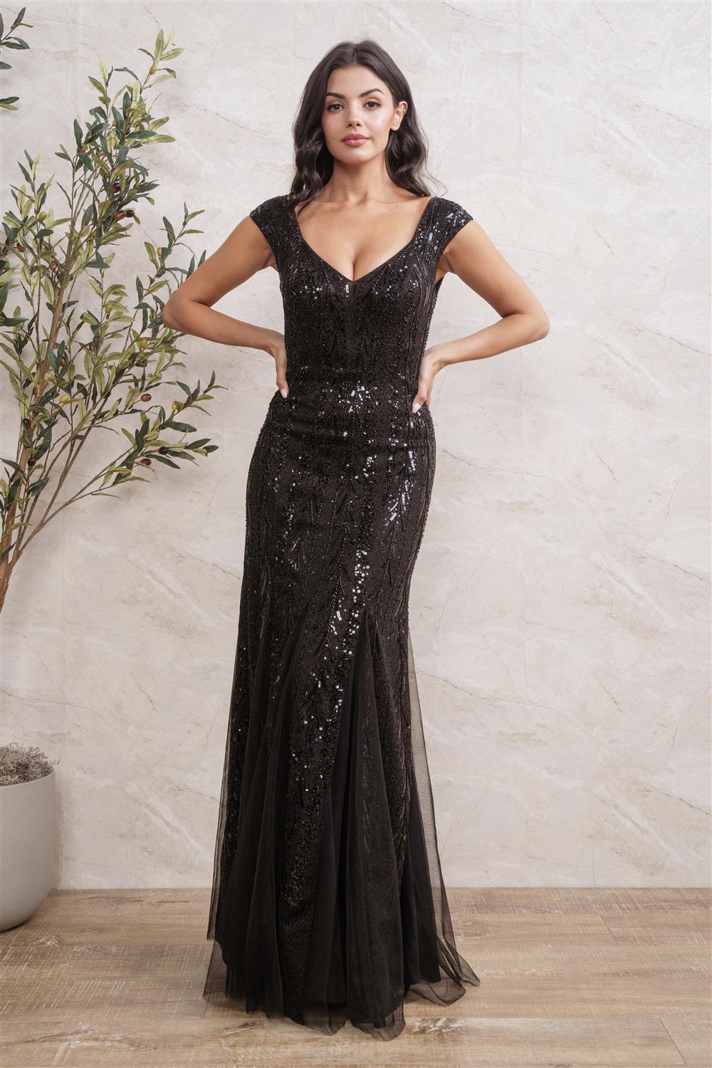 DETALLES: Espectacular vestido de fiesta completamente cubierto de intrincados bordados de lentejuelas y abalorios con un estilo vintage (Art Déco). Presenta un elegante escote en V profundo y sutiles mangas casquillo. El corte es ajustado (columna/sirena) y muy favorecedor, con una abertura frontal que da paso a un bajo de tul Ideal para galas, bodas de noche o cualquier evento de etiqueta que requiera máximo brillo y sofisticación