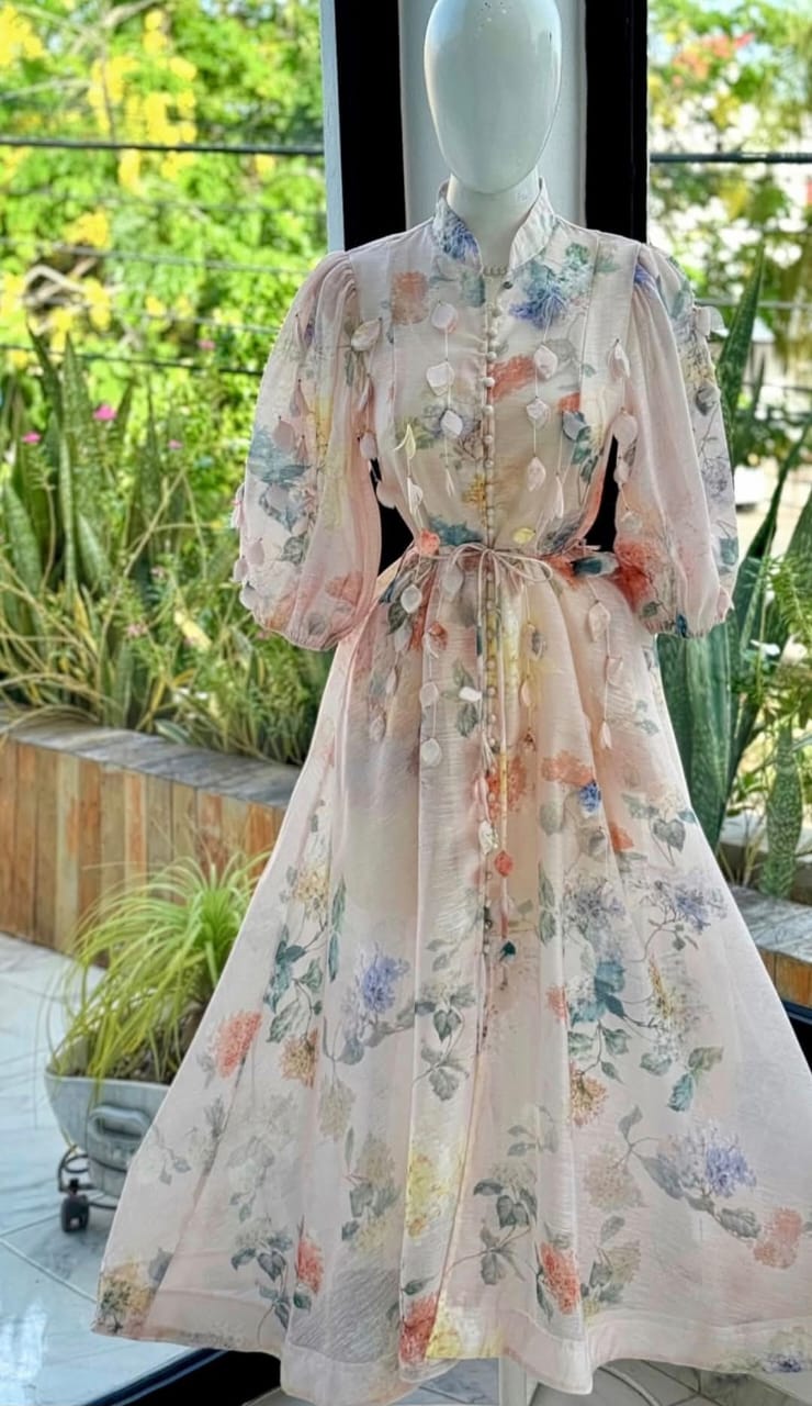 DETALLES: Romántico y sofisticado, este vestido largo en tono rosa suave con estampado floral es ideal para eventos especiales o una ocasión elegante. Destaca por su diseño vaporoso, mangas abullonadas tres cuartos y detalles en 3D con apliques tipo pompones que le dan un toque único. Incluye un delicado cinturón del mismo tejido para ajustar a la cintura.