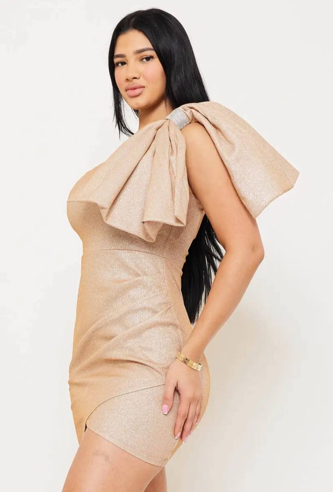 DETALLES:: Vestido moño en un hombro con tela de brillo
