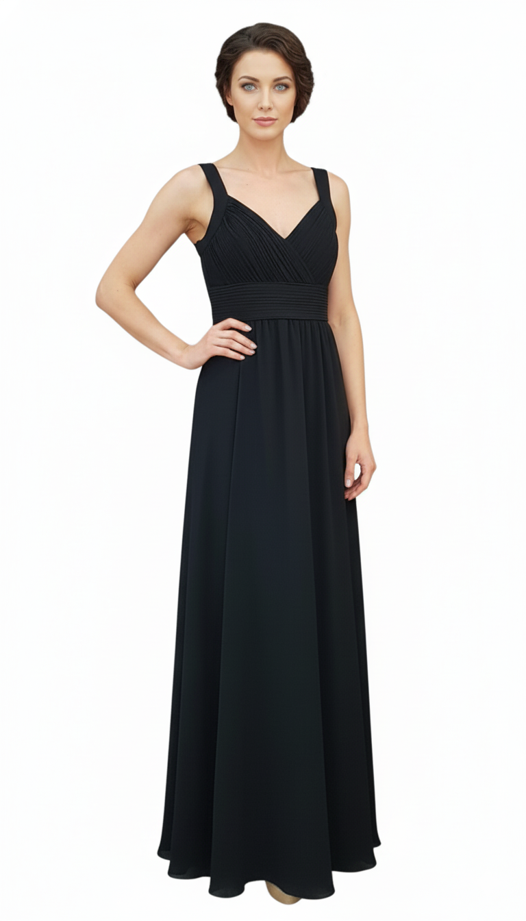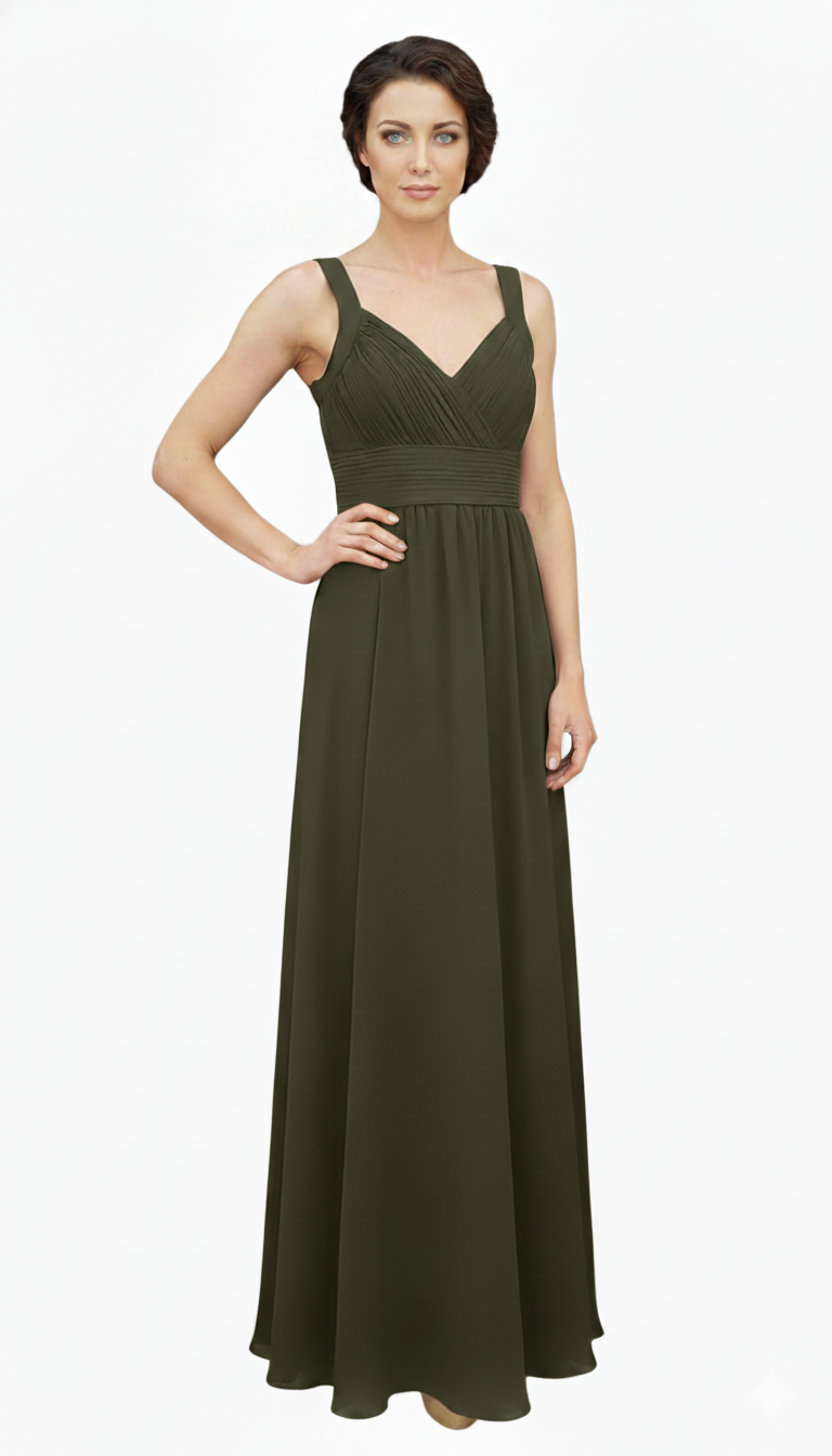 DETALLES: Vestido largo de gala con tirantes y escote en V, presenta un corpiño drapeado con detalles fruncidos en la cintura y falda de corte fluido en tela ligera.