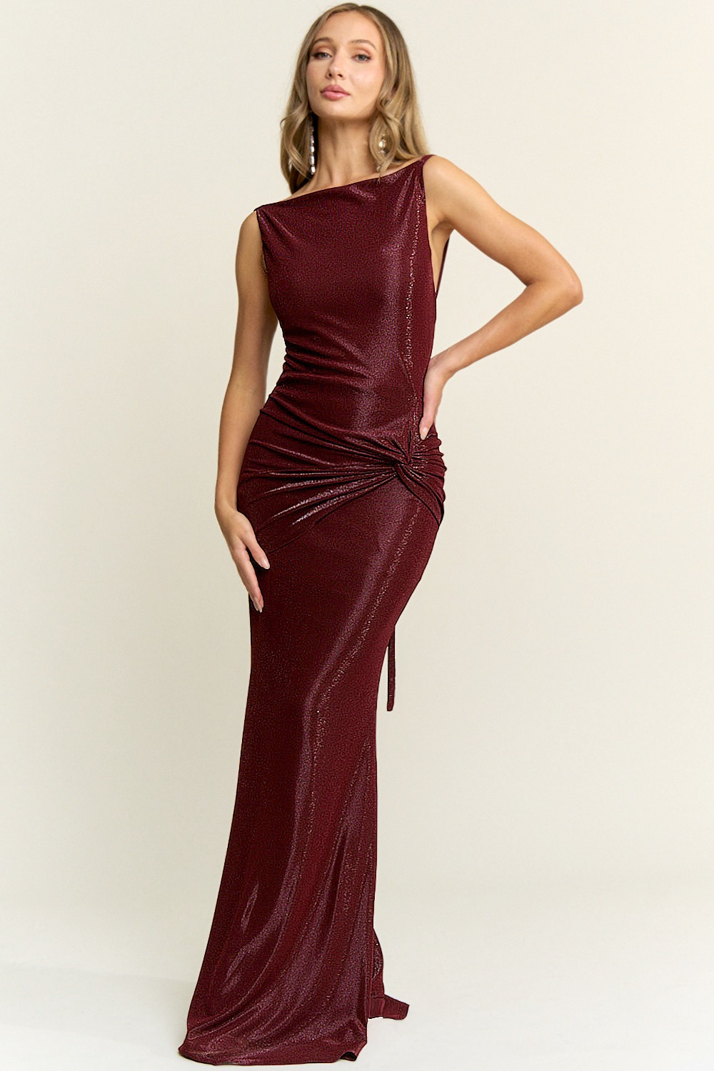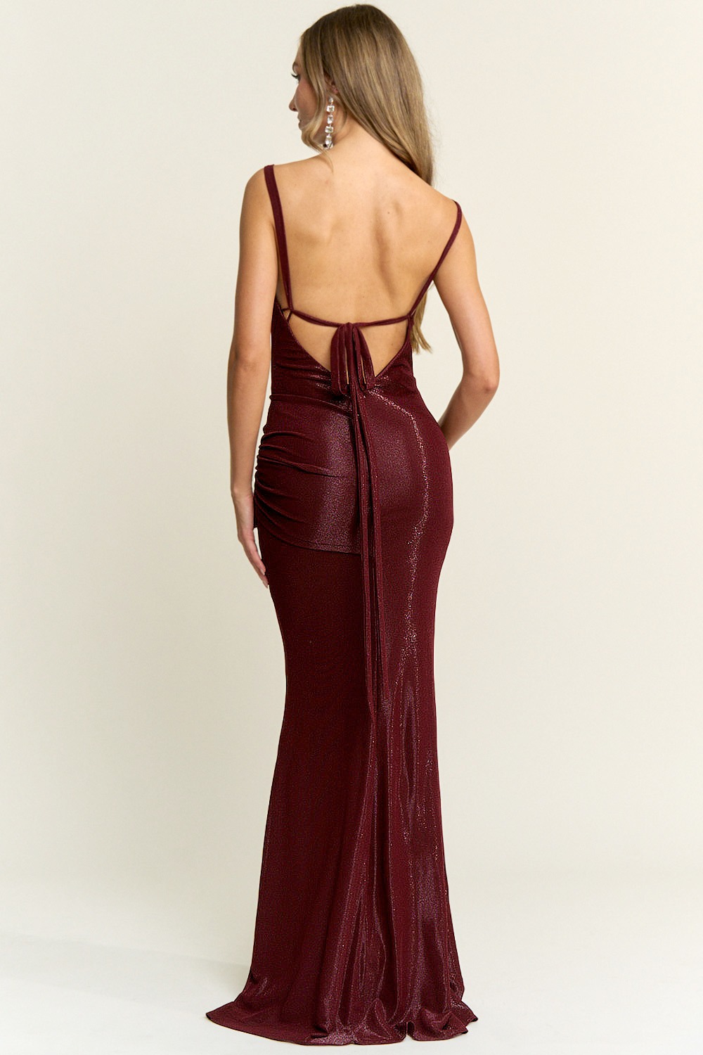 DETALLES: Vestido de noche largo en lujoso color burgundy con acabado brillante. Presenta un elegante cuello alto delantero y una silueta ajustada. El detalle drapeado (fruncido) lateral estiliza la figura. La espalda es espectacular: escote bajo con tirantes delgados cruzados y ajustables para un ajuste perfecto.