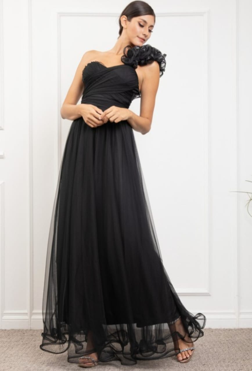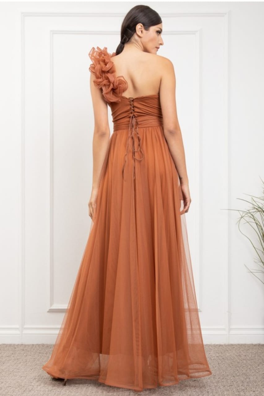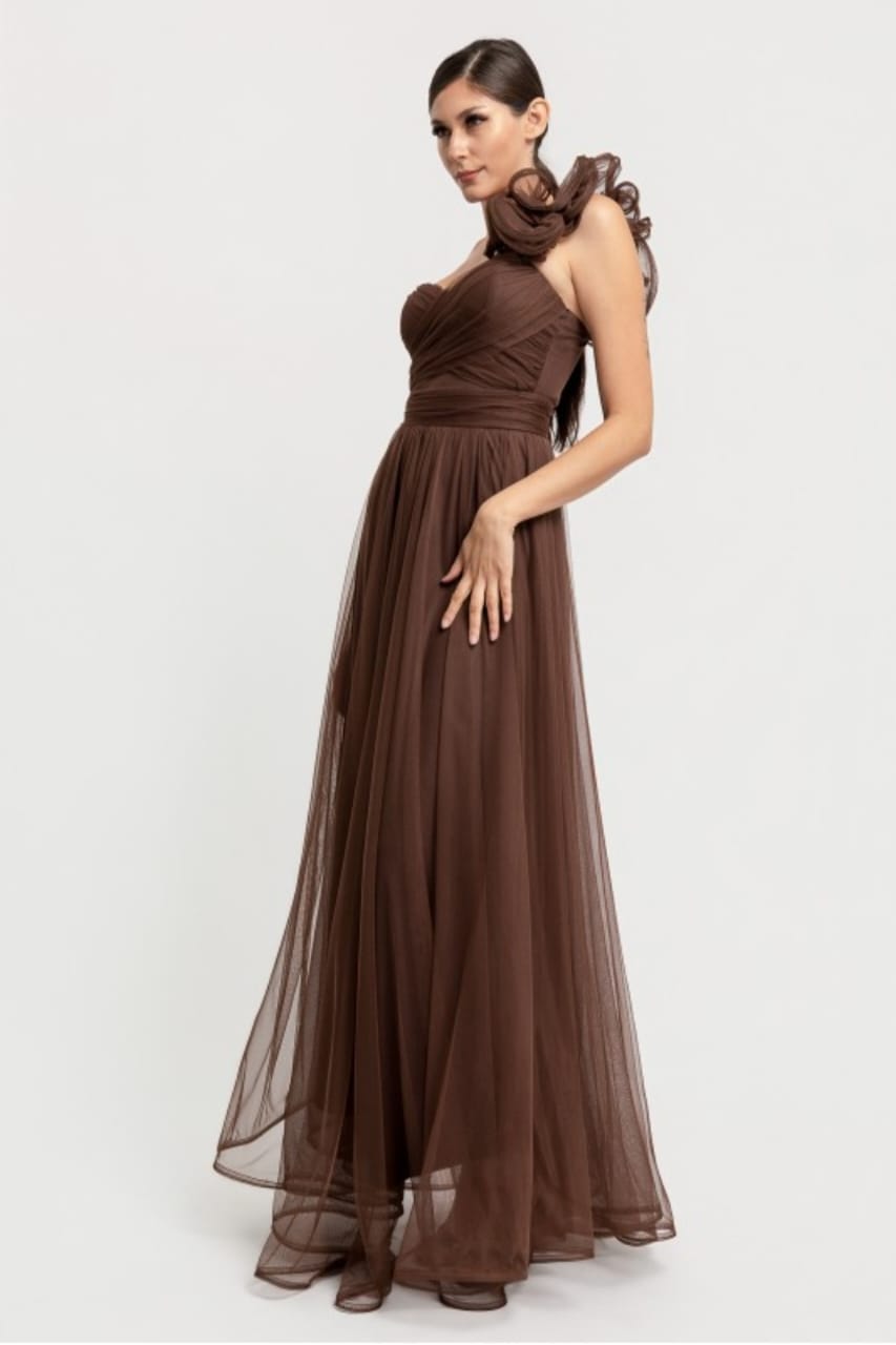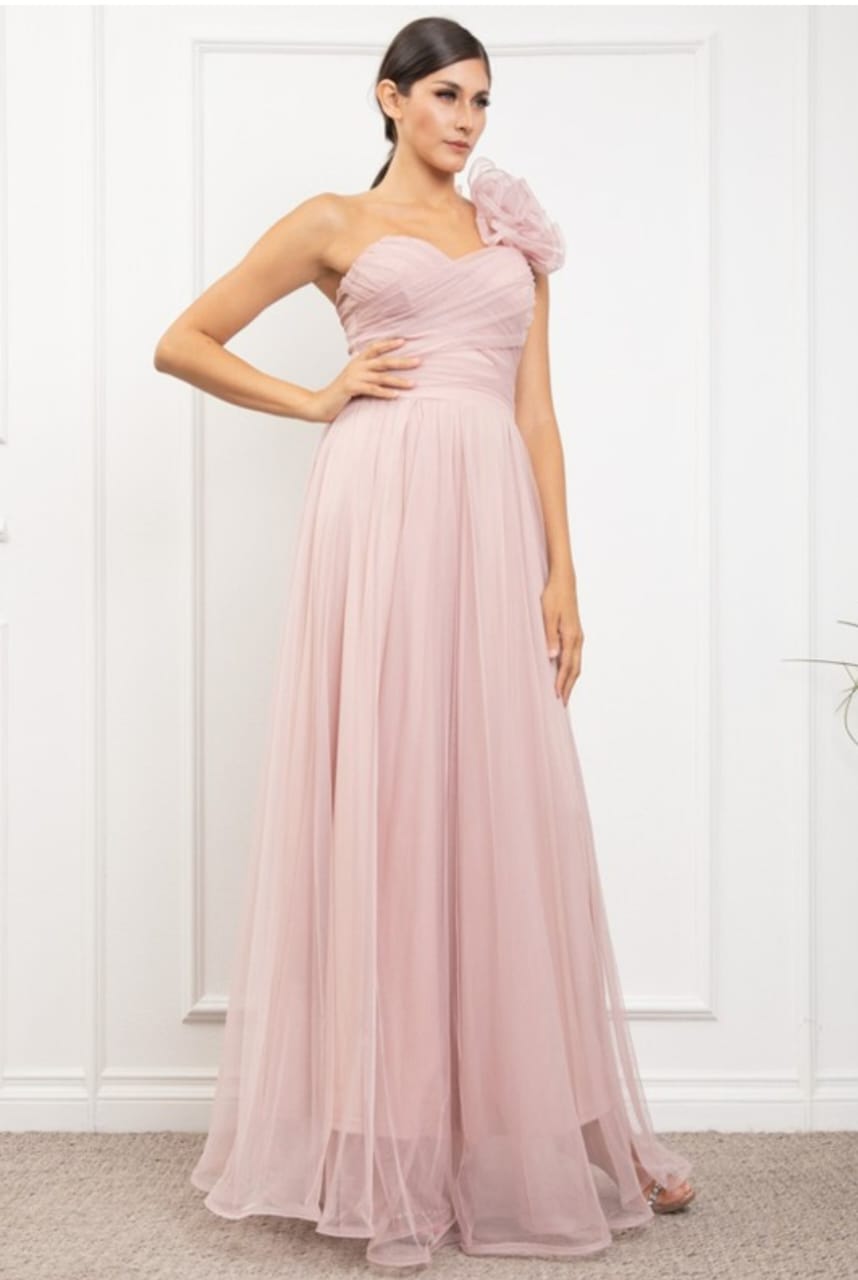 DETALLES:Vestido largo de fiesta de tul, diseño strapless con escote corazón y fruncido en el torso, falda con caída voluminosa, detalle floral en el hombro y ajuste de cordón tipo corsé en la espalda.