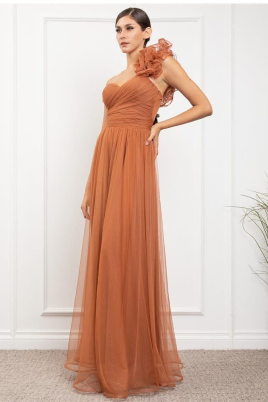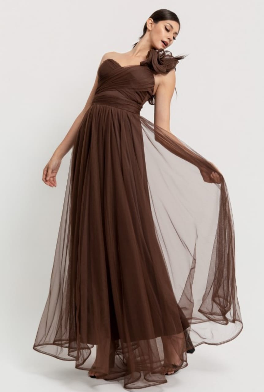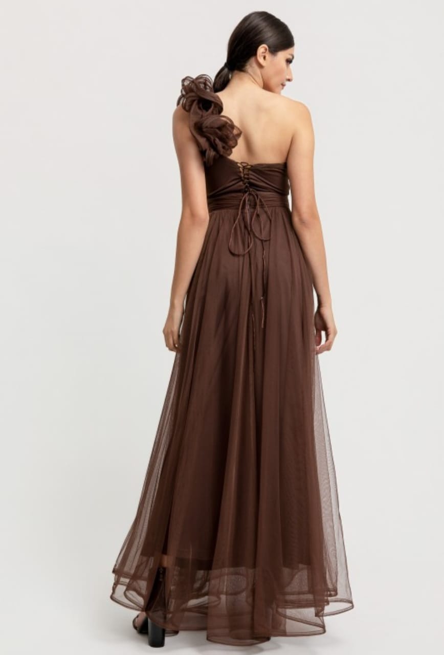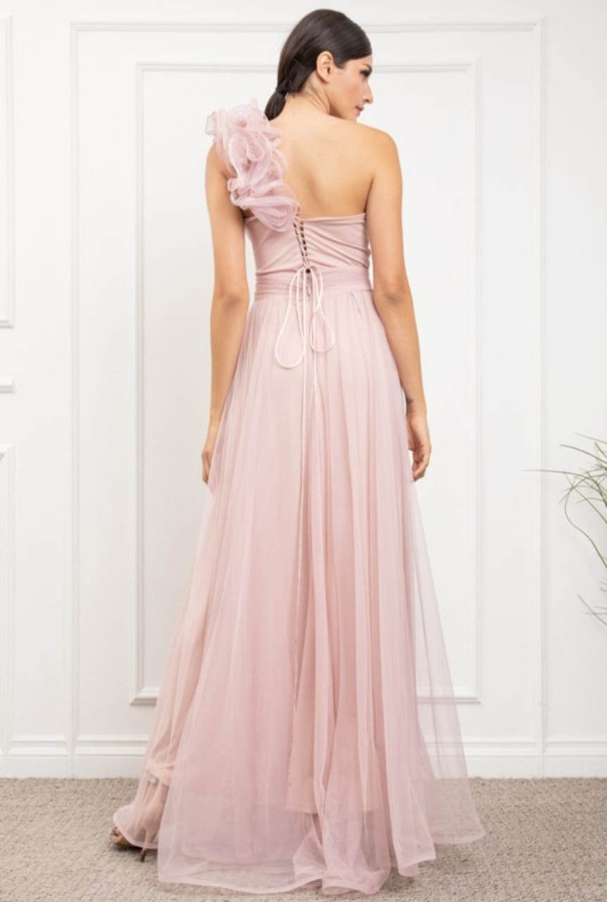 DETALLES:Vestido largo de fiesta de tul, diseño strapless con escote corazón y fruncido en el torso, falda con caída voluminosa, detalle floral en el hombro y ajuste de cordón tipo corsé en la espalda.